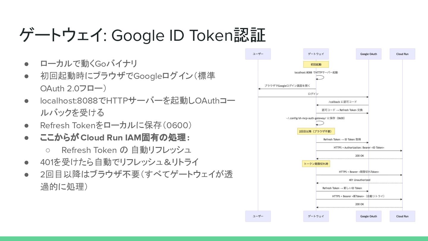 • localhost:8088でHTTPサーバーを起動しOAuthコー ルバックを受ける • Refresh Tokenをローカルに保存(0600) • ここからが Cloud Run IAM固有の処理 : ◦ Refresh Token の 自動リフレッシュ • 401を受けたら自動でリフレッシュ&リトライ • 2回目以降はブラウザ不要(すべてゲートウェイが透 過的に処理)