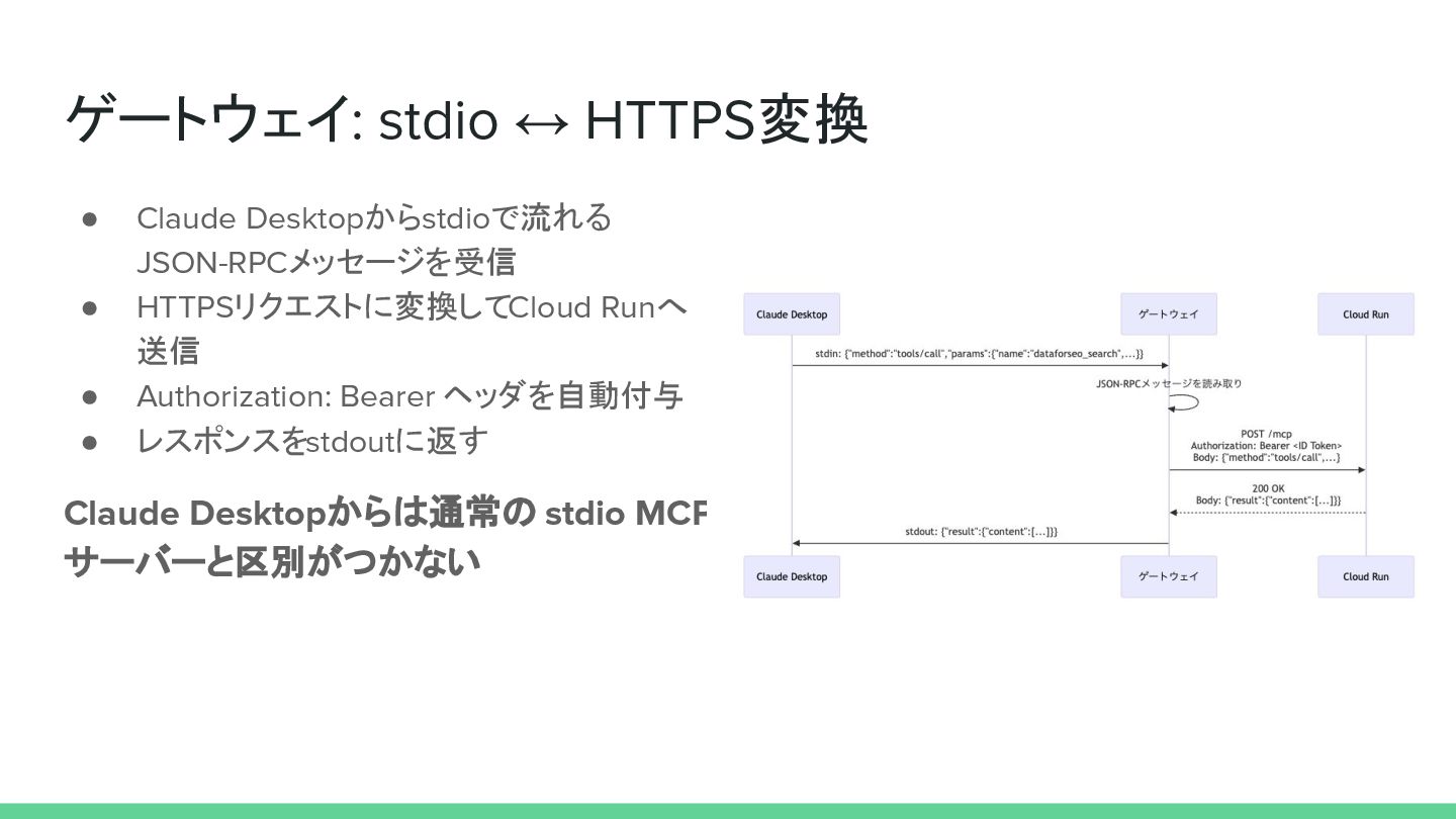 ゲートウェイ: stdio ↔ HTTPS変換 • Claude Desktopからstdioで流れる JSON-RPCメッセージを受信 • HTTPSリクエストに変換してCloud