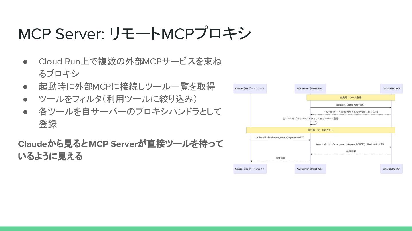 MCP Server: リモートMCPプロキシ • Cloud Run上で複数の外部MCPサービスを束ね るプロキシ • 起動時に外部MCPに接続しツール一覧を取得 •