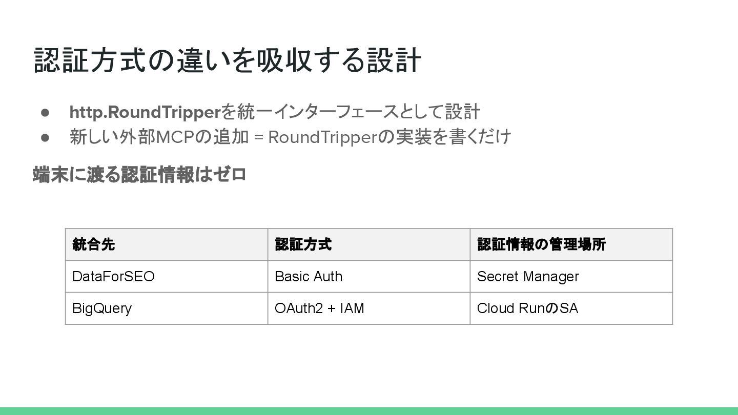 認証方式の違いを吸収する設計 • http.RoundTripperを統一インターフェースとして設計 • 新しい外部MCPの追加 = RoundTripperの実装を書くだけ 端末に渡る認証情報はゼロ 統合先 認証方式