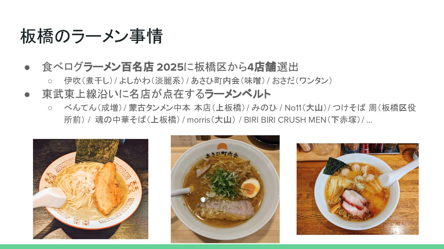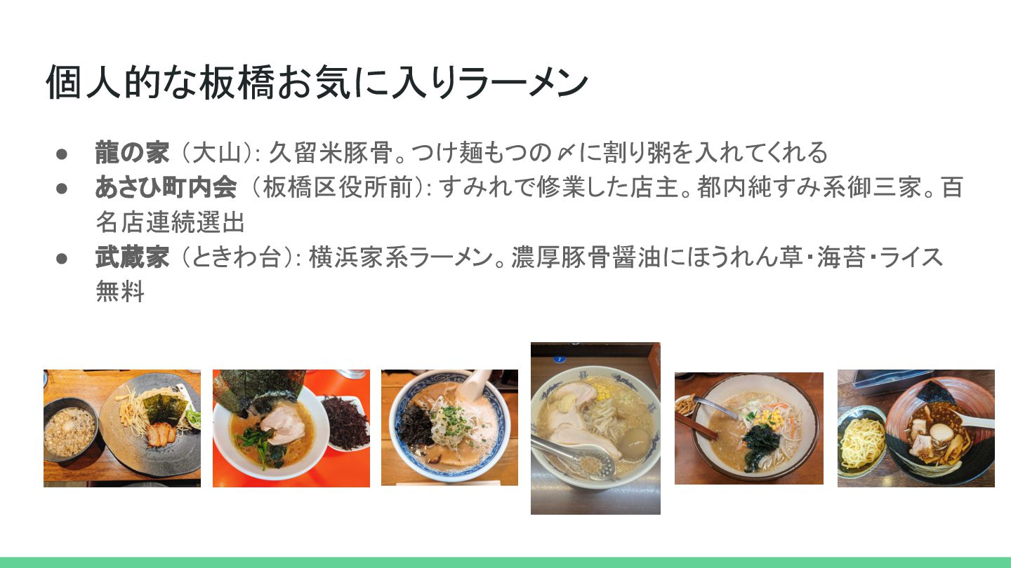 個人的な板橋お気に入りラーメン • 龍の家 (大山): 久留米豚骨。つけ麺もつの〆に割り粥を入れてくれる • あさひ町内会 (板橋区役所前): すみれで修業した店主。都内純すみ系御三家。百 名店連続選出