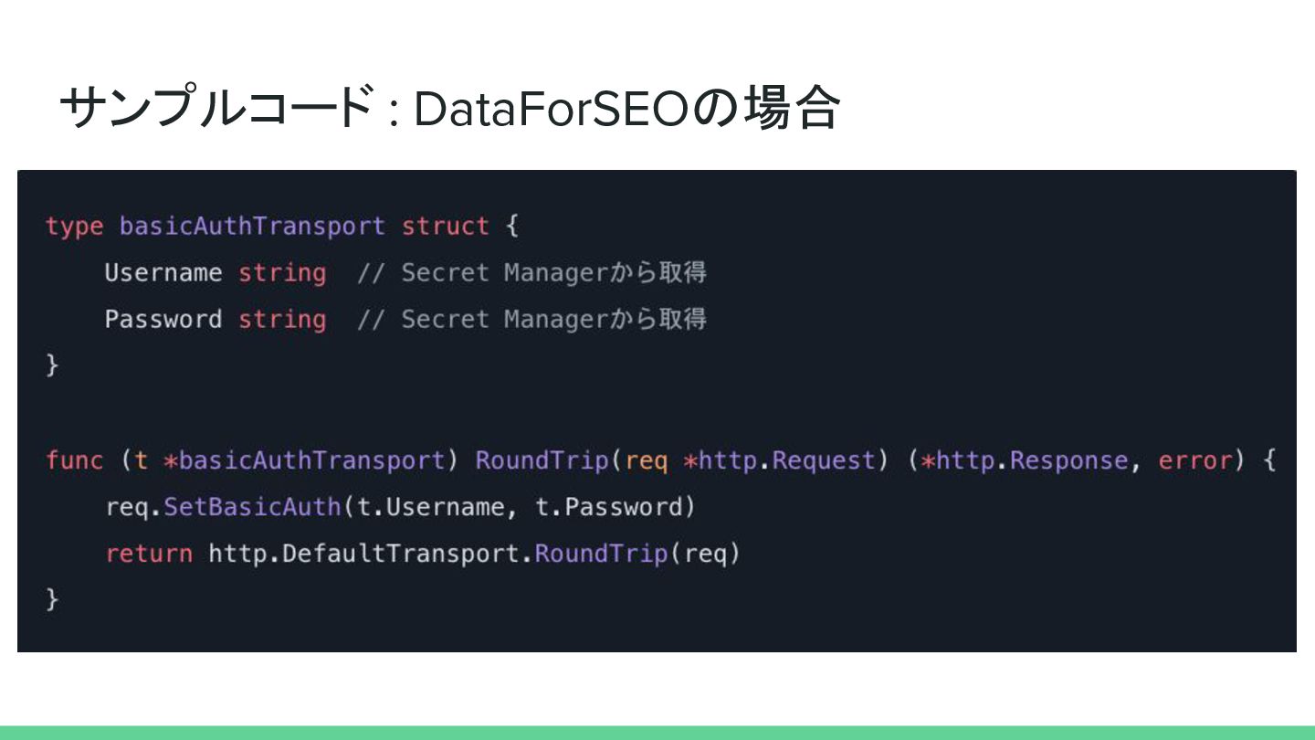 認証情報の管理場所 DataForSEO Basic Auth Secret Manager BigQuery OAuth2 + IAM Cloud RunのSA