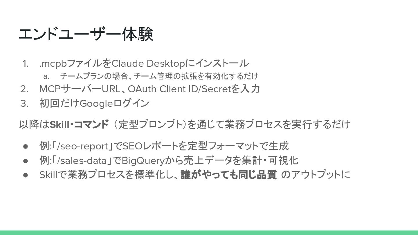 3. 初回だけGoogleログイン 以降はSkill・コマンド (定型プロンプト)を通じて業務プロセスを実行するだけ • 例:「/seo-report」でSEOレポートを定型フォーマットで生成 • 例:「/sales-data」でBigQueryから売上データを集計・可視化 • Skillで業務プロセスを標準化し、誰がやっても同じ品質 のアウトプットに