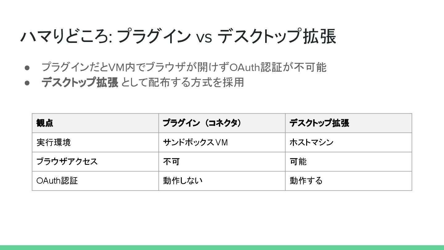 ハマりどころ: プラグイン vs デスクトップ拡張 • プラグインだとVM内でブラウザが開けずOAuth認証が不可能 • デスクトップ拡張 として配布する方式を採用 観点