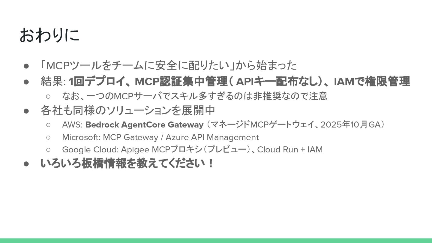おわりに • 「MCPツールをチームに安全に配りたい」から始まった • 結果: 1回デプロイ、 MCP認証集中管理( APIキー配布なし)、 IAMで権限管理 ◦