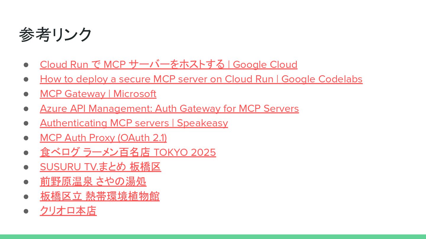 • How to deploy a secure MCP server on Cloud Run | Google Codelabs • MCP Gateway | Microsoft • Azure API Management: Auth Gateway for MCP Servers • Authenticating MCP servers | Speakeasy • MCP Auth Proxy (OAuth 2.1) • 食べログ ラーメン百名店 TOKYO 2025 • SUSURU TV.まとめ 板橋区 • 前野原温泉 さやの湯処 • 板橋区立 熱帯環境植物館 • クリオロ本店