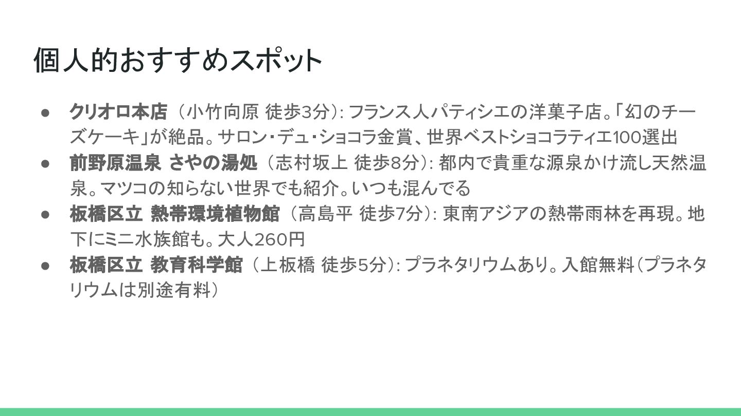 個人的おすすめスポット • クリオロ本店 (小竹向原 徒歩3分): フランス人パティシエの洋菓子店。「幻のチー ズケーキ」が絶品。サロン・デュ・ショコラ金賞、世界ベストショコラティエ100選出 • 前野原温泉 さやの湯処