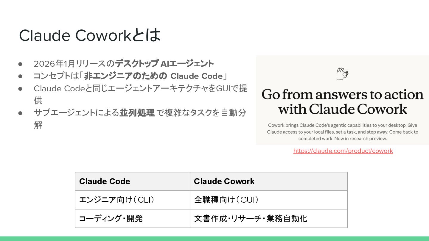 Claude Codeと同じエージェントアーキテクチャをGUIで提 供 • サブエージェントによる並列処理で複雑なタスクを自動分 解 Claude Code Claude Cowork エンジニア向け(CLI) 全職種向け(GUI) コーディング・開発 文書作成・リサーチ・業務自動化 https://claude.com/product/cowork