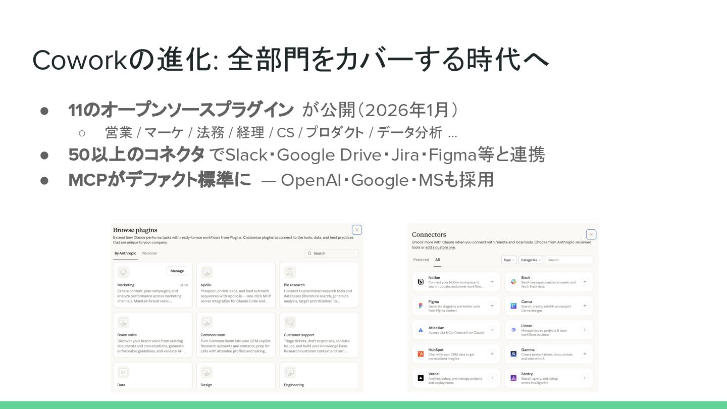 Coworkの進化: 全部門をカバーする時代へ • 11のオープンソースプラグイン が公開(2026年1月) ◦ 営業 / マーケ /