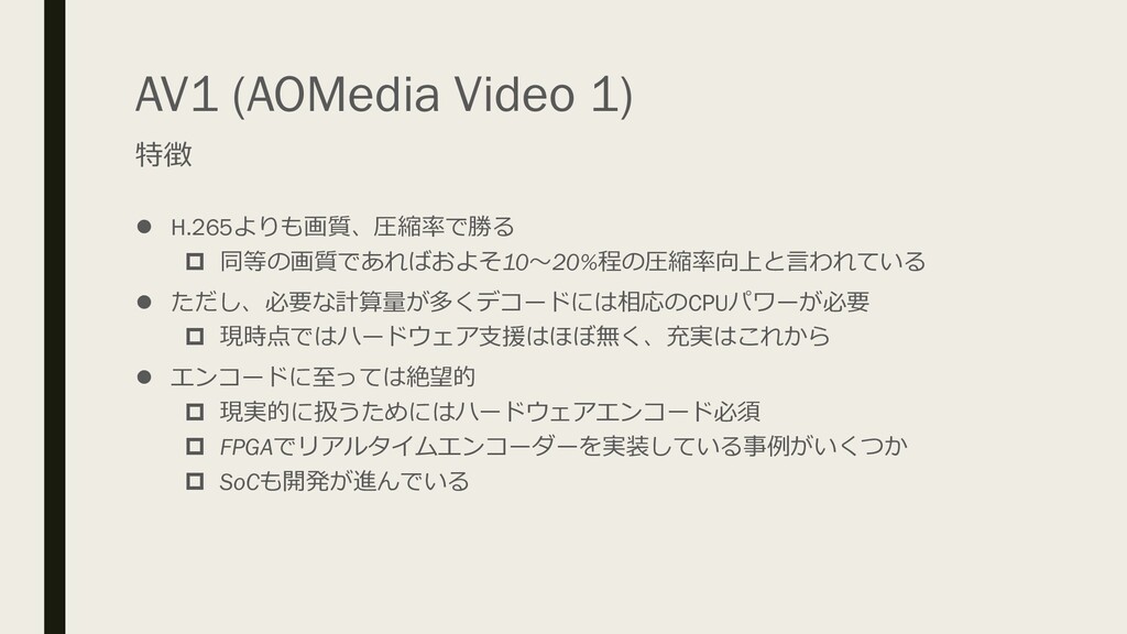 ただし、必要な計算量が多くデコードには相応のCPUパワーが必要 現時点ではハードウェア支援はほぼ無く、充実はこれから ⚫ エンコードに至っては絶望的 現実的に扱うためにはハードウェアエンコード必須 FPGAでリアルタイムエンコーダーを実装している事例がいくつか SoCも開発が進んでいる