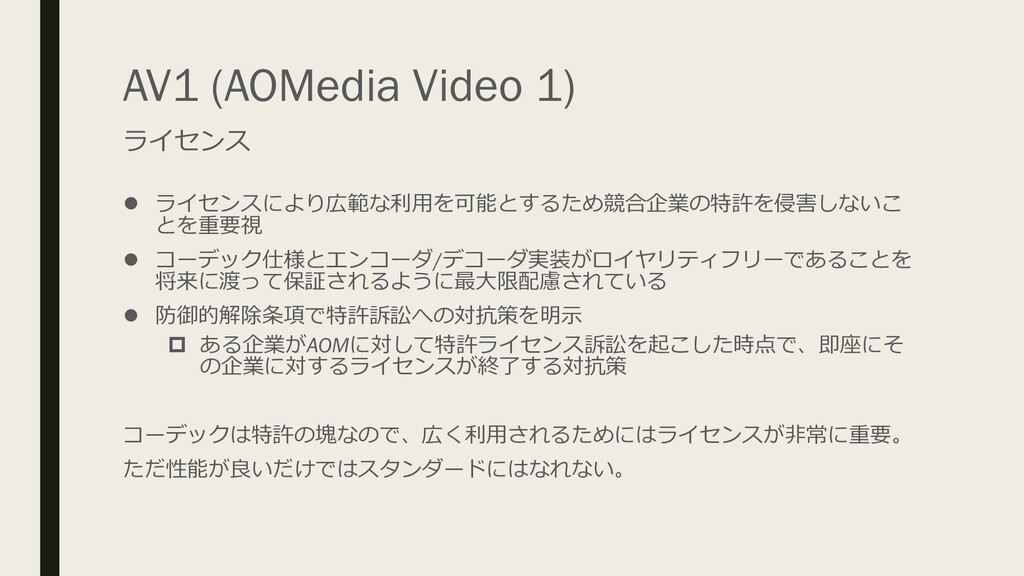 将来に渡って保証されるように最大限配慮されている ⚫ 防御的解除条項で特許訴訟への対抗策を明示 ある企業がAOMに対して特許ライセンス訴訟を起こした時点で、即座にそ の企業に対するライセンスが終了する対抗策 コーデックは特許の塊なので、広く利用されるためにはライセンスが非常に重要。 ただ性能が良いだけではスタンダードにはなれない。