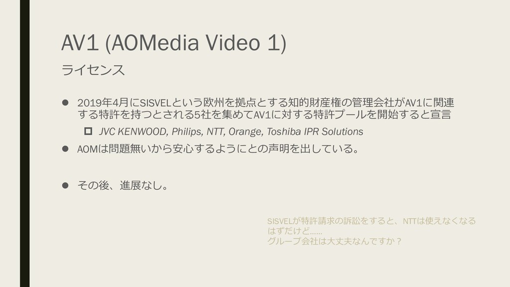 KENWOOD, Philips, NTT, Orange, Toshiba IPR Solutions ⚫ AOMは問題無いから安心するようにとの声明を出している。 ⚫ その後、進展なし。 SISVELが特許請求の訴訟をすると、NTTは使えなくなる はずだけど…… グループ会社は大丈夫なんですか?