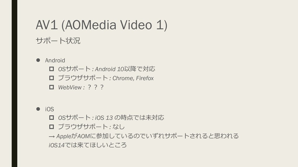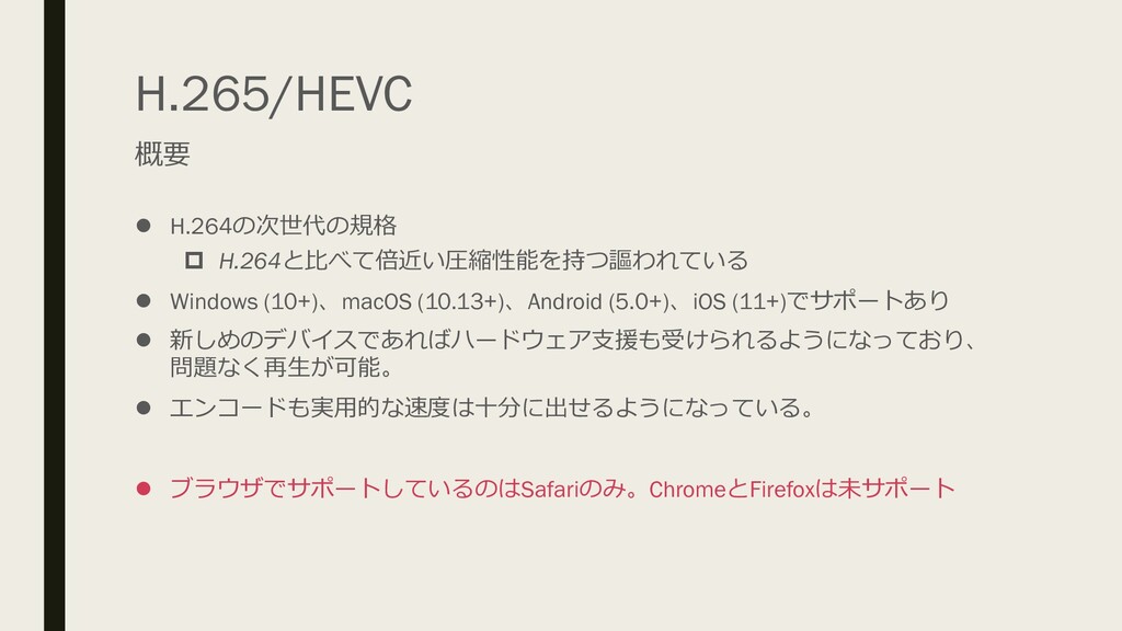(5.0+)、iOS (11+)でサポートあり ⚫ 新しめのデバイスであればハードウェア支援も受けられるようになっており、 問題なく再生が可能。 ⚫ エンコードも実用的な速度は十分に出せるようになっている。 ⚫ ブラウザでサポートしているのはSafariのみ。ChromeとFirefoxは未サポート