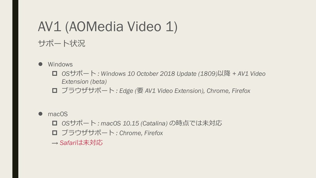 Windows 10 October 2018 Update (1809)以降 + AV1 Video Extension (beta) ブラウザサポート : Edge (要 AV1 Video Extension), Chrome, Firefox ⚫ macOS OSサポート : macOS 10.15 (Catalina) の時点では未対応 ブラウザサポート : Chrome, Firefox → Safariは未対応