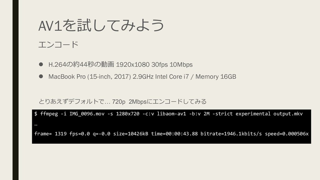 AV1を試してみよう エンコード ⚫ H.264の約44秒の動画 1920x1080 30fps 10Mbps ⚫ MacBook Pro