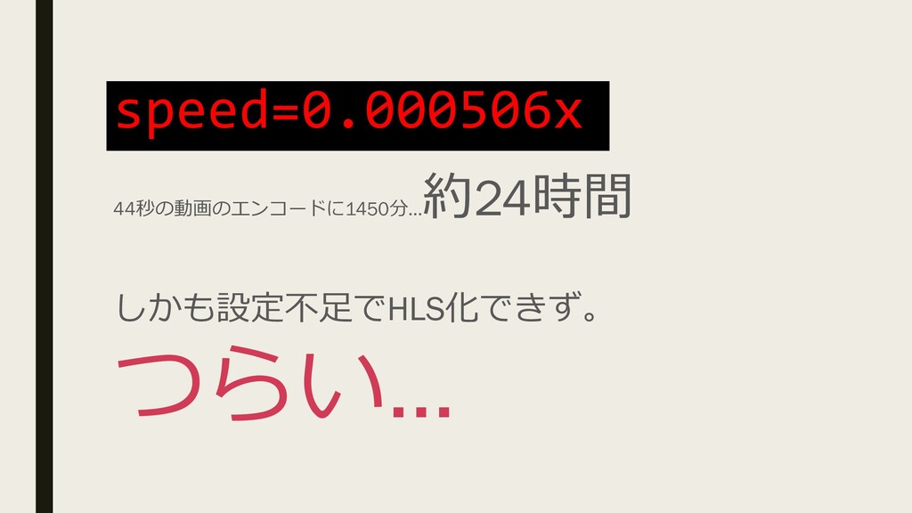 44秒の動画のエンコードに1450分… 約24時間 しかも設定不足でHLS化できず。 つらい… speed=0.000506x