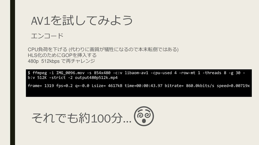 -cpu-used 4 -row-mt 1 -threads 8 -g 30 - b:v 512K -strict -2 output480p512k.mp4 frame= 1319 fps=0.2 q=-0.0 Lsize= 4617kB time=00:00:43.97 bitrate= 860.0kbits/s speed=0.00719x CPU負荷を下げる (代わりに画質が犠牲になるので本末転倒ではある) HLS化のためにGOPを挿入する 480p 512kbps で再チャレンジ それでも約100分…