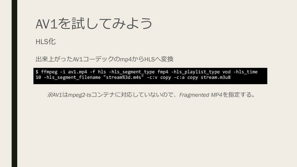 AV1を試してみよう HLS化 $ ffmpeg -i av1.mp4 -f hls -hls_segment_type fmp4