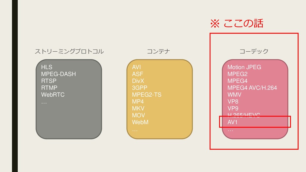 MPEG4 MPEG4 AVC/H.264 WMV VP8 VP9 H.265/HEVC AV1 … AVI ASF DivX 3GPP MPEG2-TS MP4 MKV MOV WebM … コンテナ コーデック ※ ここの話
