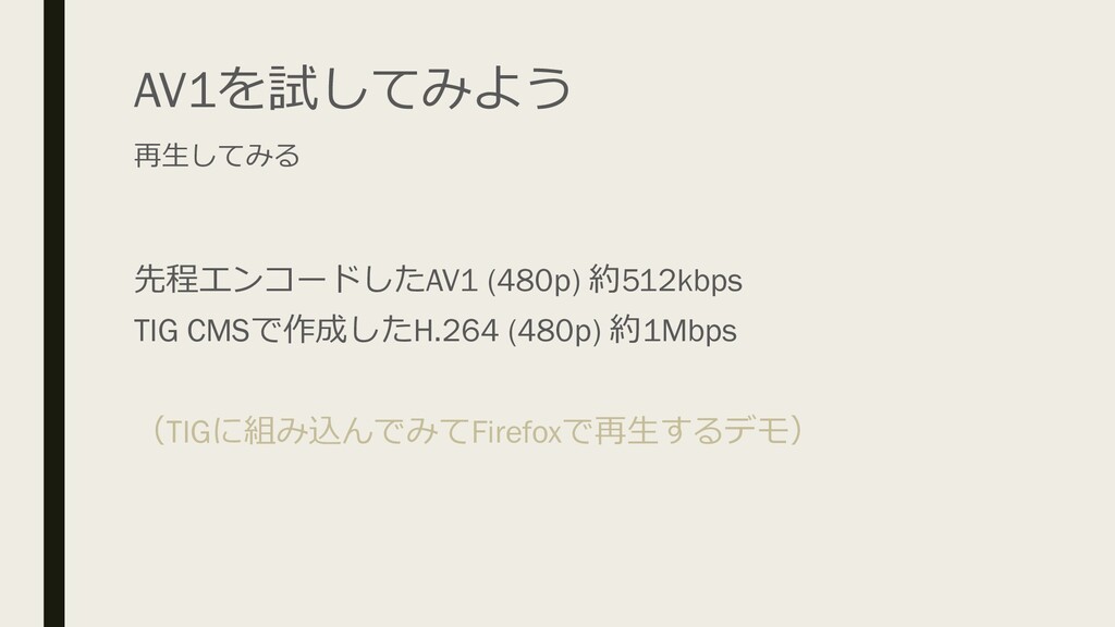 AV1を試してみよう 再生してみる 先程エンコードしたAV1 (480p) 約512kbps TIG CMSで作成したH.264 (480p) 約1Mbps (TIGに組み込んでみてFirefoxで再生するデモ)