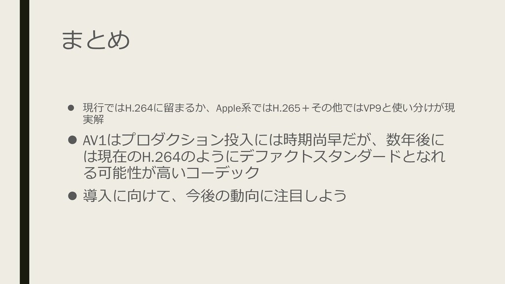 まとめ ⚫ 現行ではH.264に留まるか、Apple系ではH.265+その他ではVP9と使い分けが現 実解 ⚫ AV1はプロダクション投入には時期尚早だが、数年後に は現在のH.264のようにデファクトスタンダードとなれ る可能性が高いコーデック ⚫ 導入に向けて、今後の動向に注目しよう