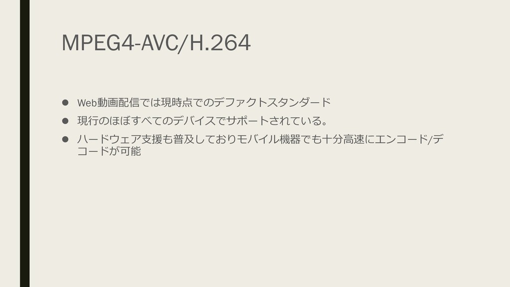 MPEG4-AVC/H.264 ⚫ Web動画配信では現時点でのデファクトスタンダード ⚫ 現行のほぼすべてのデバイスでサポートされている。 ⚫ ハードウェア支援も普及しておりモバイル機器でも十分高速にエンコード/デ コードが可能