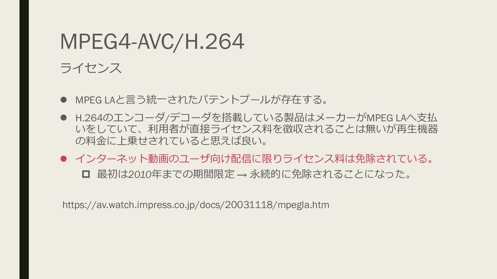 ⚫ インターネット動画のユーザ向け配信に限りライセンス料は免除されている。 最初は2010年までの期間限定 → 永続的に免除されることになった。 https://av.watch.impress.co.jp/docs/20031118/mpegla.htm