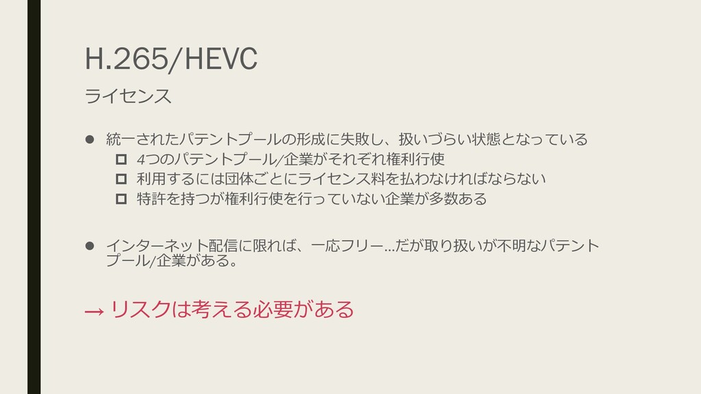 H.265/HEVC ライセンス ⚫ 統一されたパテントプールの形成に失敗し、扱いづらい状態となっている 4つのパテントプール/企業がそれぞれ権利行使 利用するには団体ごとにライセンス料を払わなければならない 特許を持つが権利行使を行っていない企業が多数ある