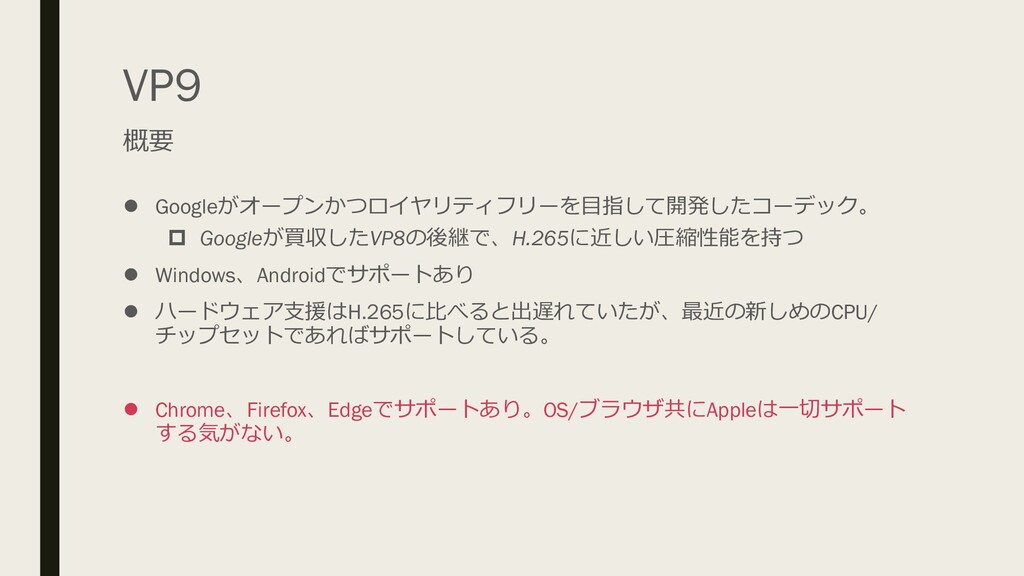 VP9 概要 ⚫ Googleがオープンかつロイヤリティフリーを目指して開発したコーデック。 Googleが買収したVP8の後継で、H.265に近しい圧縮性能を持つ ⚫ Windows、Androidでサポートあり ⚫ ハードウェア支援はH.265に比べると出遅れていたが、最近の新しめのCPU/