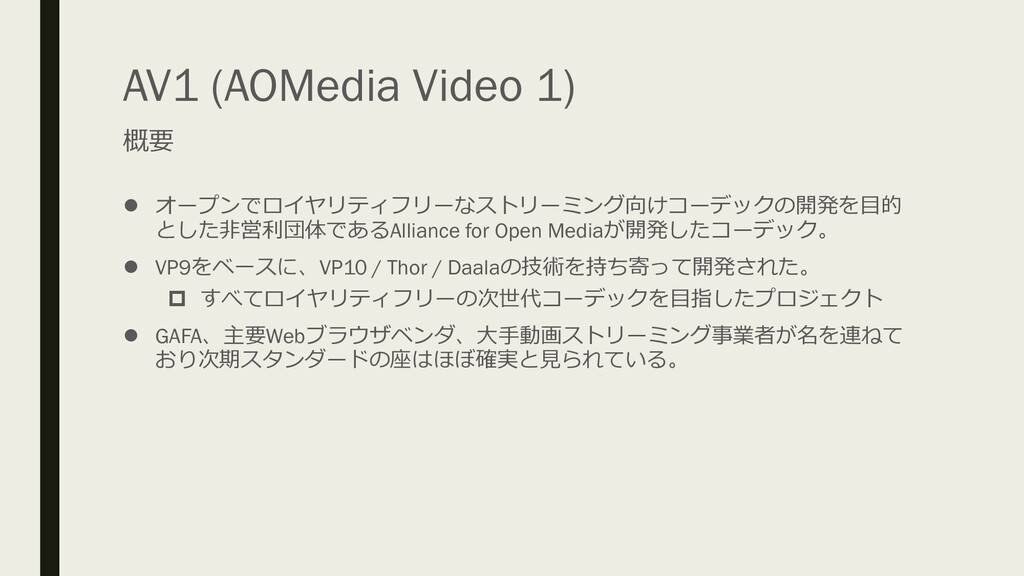 AV1 (AOMedia Video 1) 概要 ⚫ オープンでロイヤリティフリーなストリーミング向けコーデックの開発を目的 とした非営利団体であるAlliance for Open