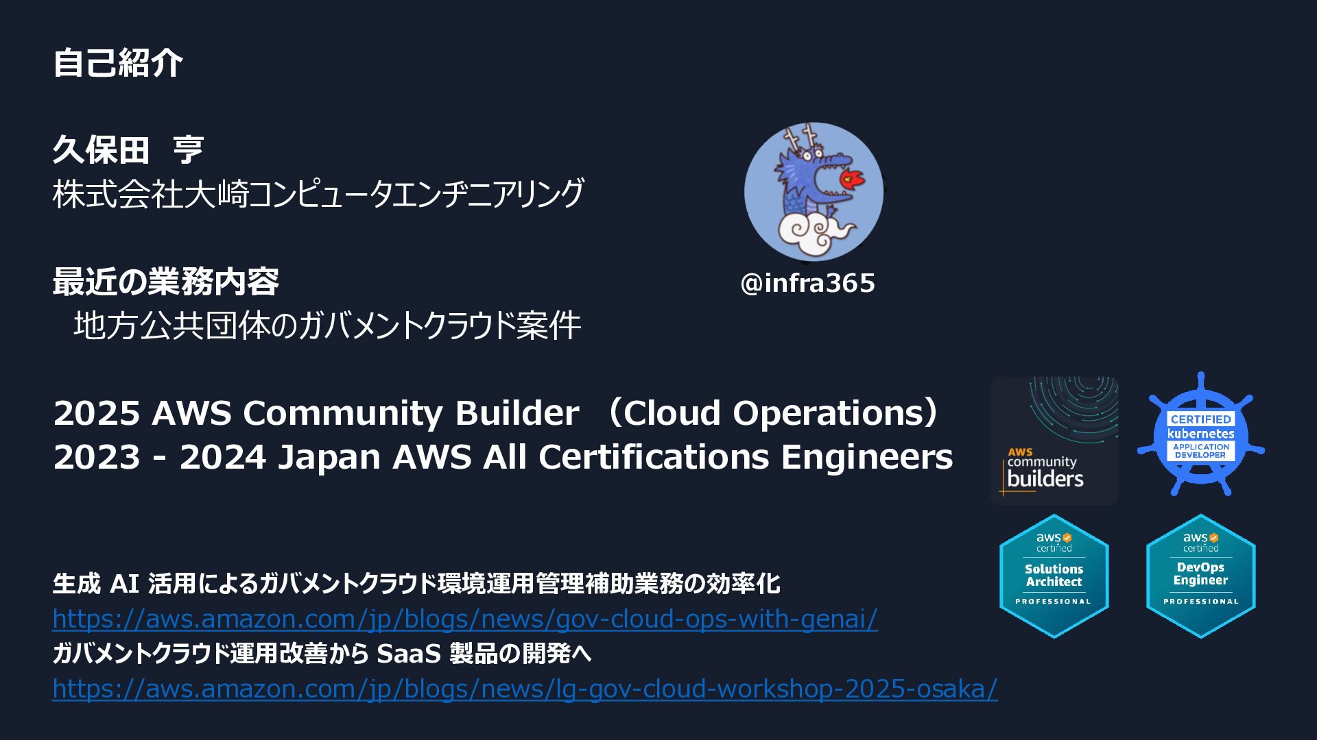 (Cloud Operations) 2023 - 2024 Japan AWS All Certifications Engineers 生成 AI 活用によるガバメントクラウド環境運用管理補助業務の効率化 https://aws.amazon.com/jp/blogs/news/gov-cloud-ops-with-genai/ ガバメントクラウド運用改善から SaaS 製品の開発へ https://aws.amazon.com/jp/blogs/news/lg-gov-cloud-workshop-2025-osaka/ @infra365