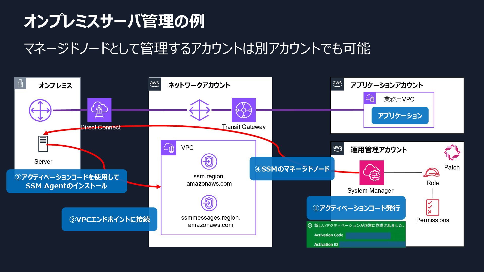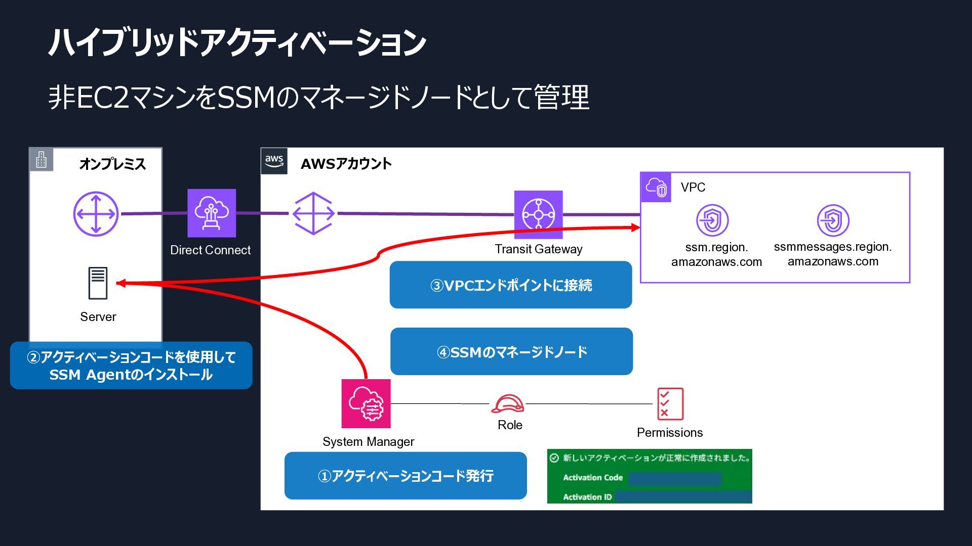 amazonaws.com ②アクティベーションコードを使用して SSM Agentのインストール System Manager Role Permissions ①アクティベーションコード発行 ③VPCエンドポイントに接続 ④SSMのマネージドノード Direct Connect Transit Gateway