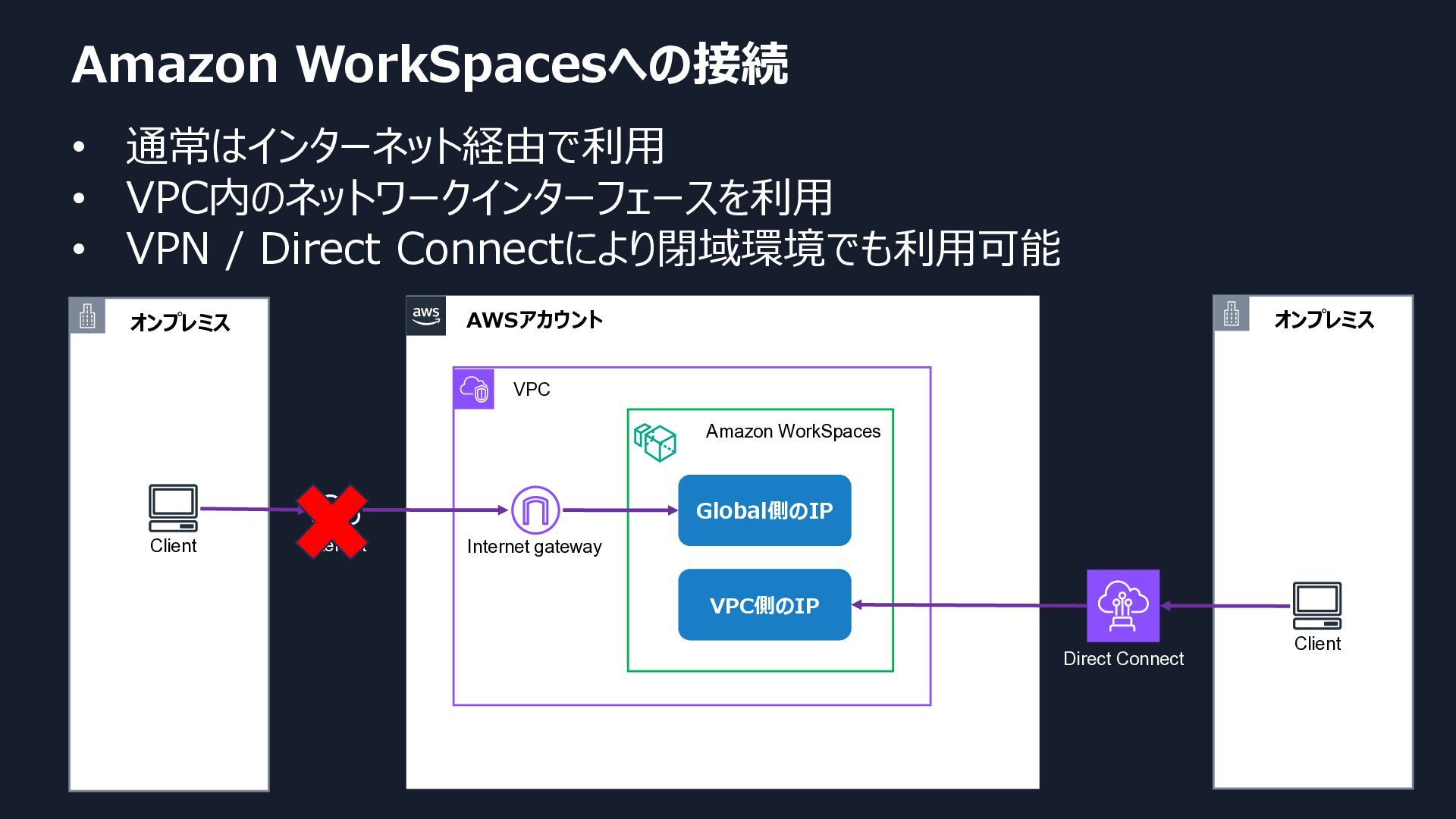 Connectにより閉域環境でも利用可能 AWSアカウント VPC Internet gateway Global側のIP オンプレミス Client VPC側のIP Internet Amazon WorkSpaces Direct Connect オンプレミス Client