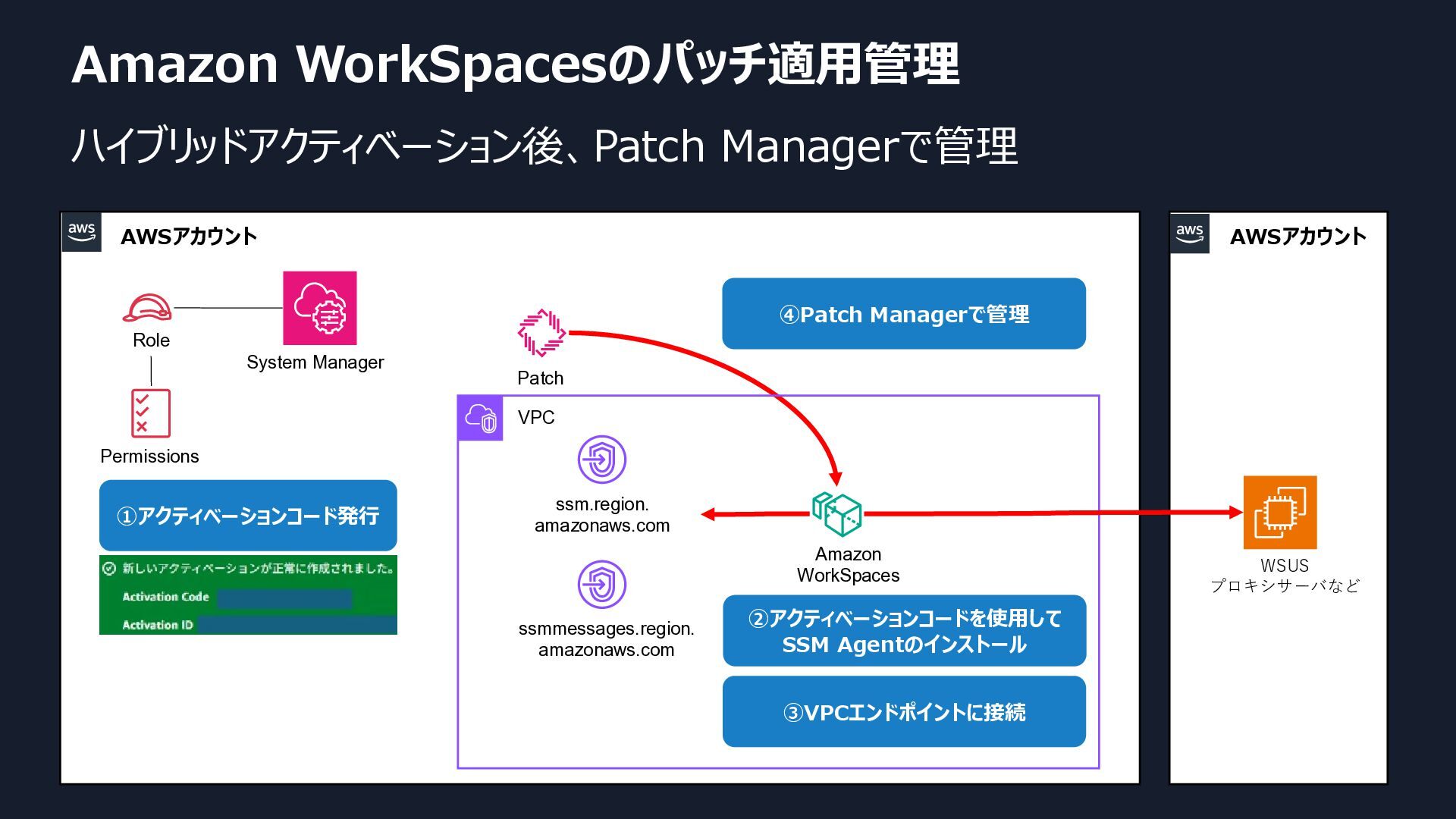 VPC ssm.region. amazonaws.com ssmmessages.region. amazonaws.com Amazon WorkSpaces Patch WSUS プロキシサーバなど ①アクティベーションコード発行 ②アクティベーションコードを使用して SSM Agentのインストール ③VPCエンドポイントに接続 ④Patch Managerで管理