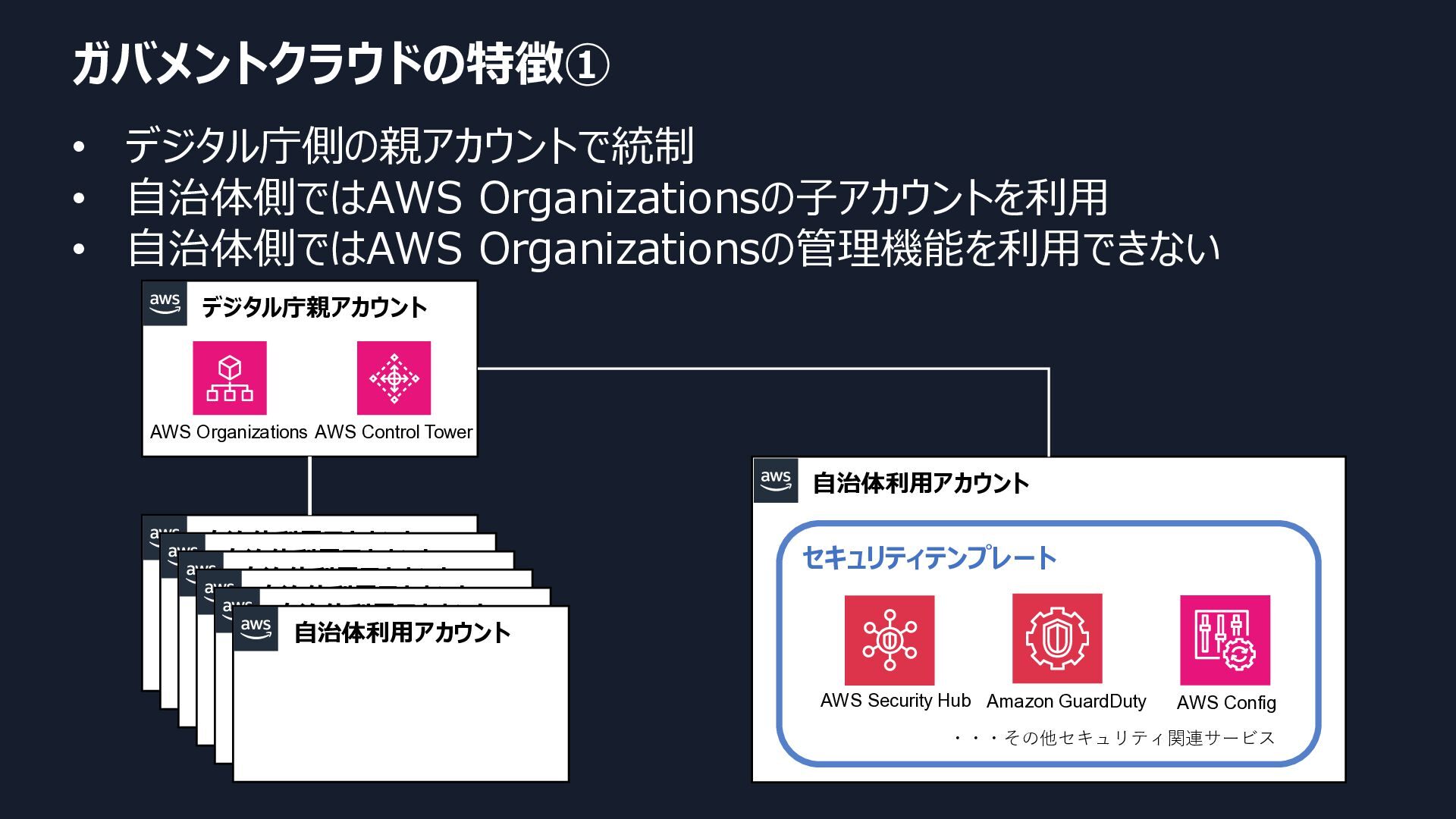 自治体利用アカウント 自治体利用アカウント 自治体利用アカウント 自治体利用アカウント 自治体利用アカウント 自治体利用アカウント AWS Organizations 自治体利用アカウント AWS Control Tower セキュリティテンプレート AWS Security Hub Amazon GuardDuty AWS Config ・・・その他セキュリティ関連サービス