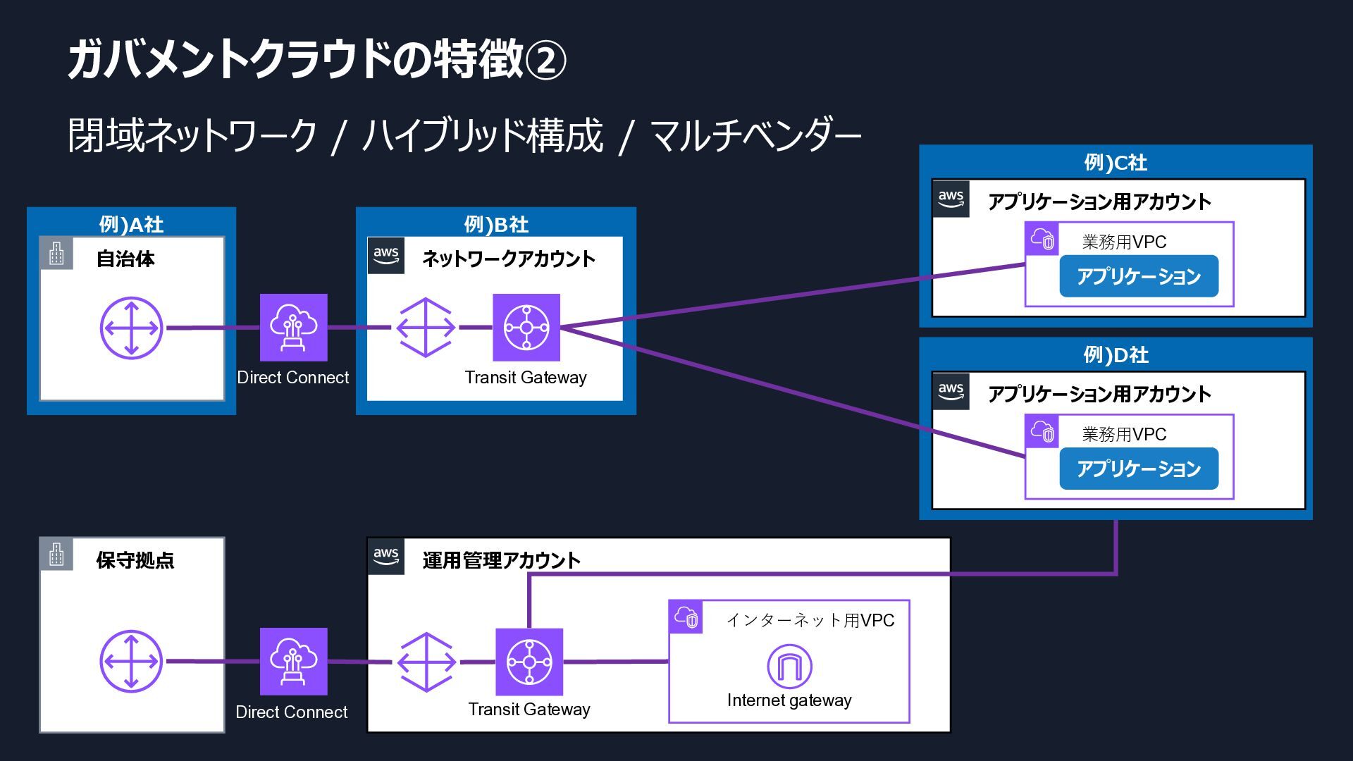 自治体 アプリケーション用アカウント 運用管理アカウント 保守拠点 業務用VPC アプリケーション インターネット用VPC Internet gateway Direct Connect Direct Connect Transit Gateway Transit Gateway 例)D社 アプリケーション用アカウント 業務用VPC アプリケーション