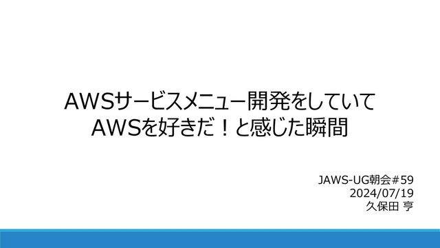 AWSサービスメニュー開発をしていて AWSを好きだ!と感じた瞬間 JAWS-UG朝会#59 2024/07/19 久保田 亨