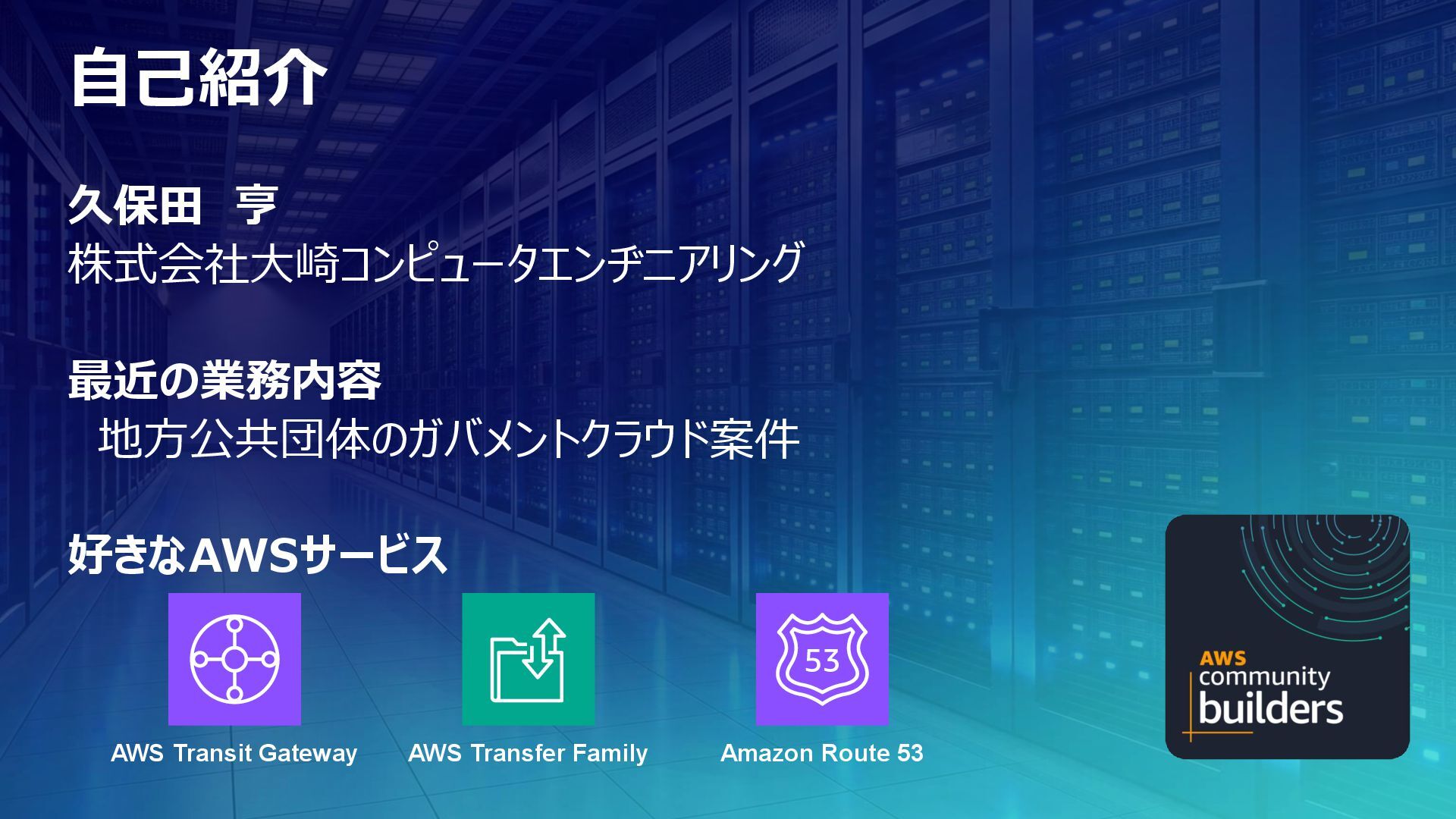 自己紹介 久保田 亨 株式会社大崎コンピュータエンヂニアリング 最近の業務内容 地方公共団体のガバメントクラウド案件 好きなAWSサービス AWS Transit Gateway