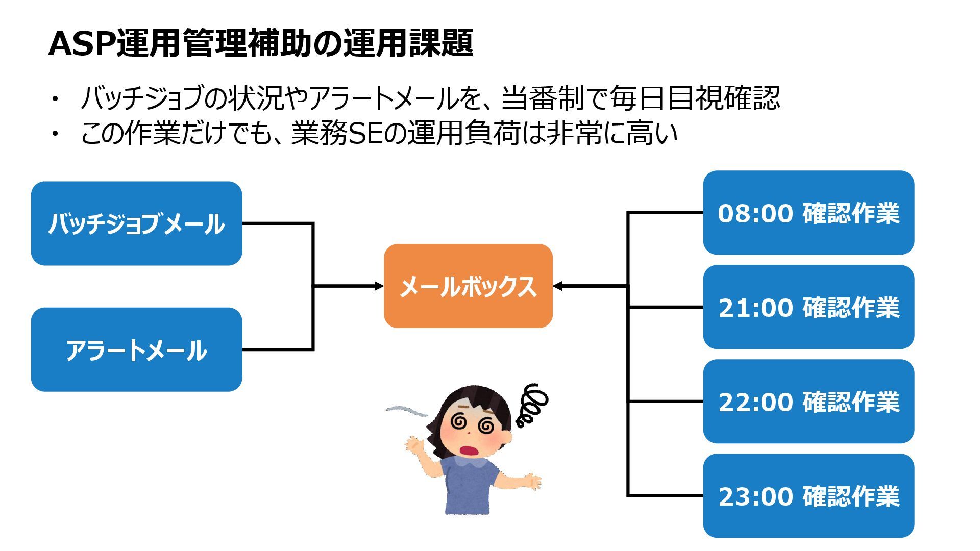 ASP運用管理補助の運用課題 ・ バッチジョブの状況やアラートメールを、当番制で毎日目視確認 ・ この作業だけでも、業務SEの運用負荷は非常に高い バッチジョブメール アラートメール メールボックス 08:00 確認作業