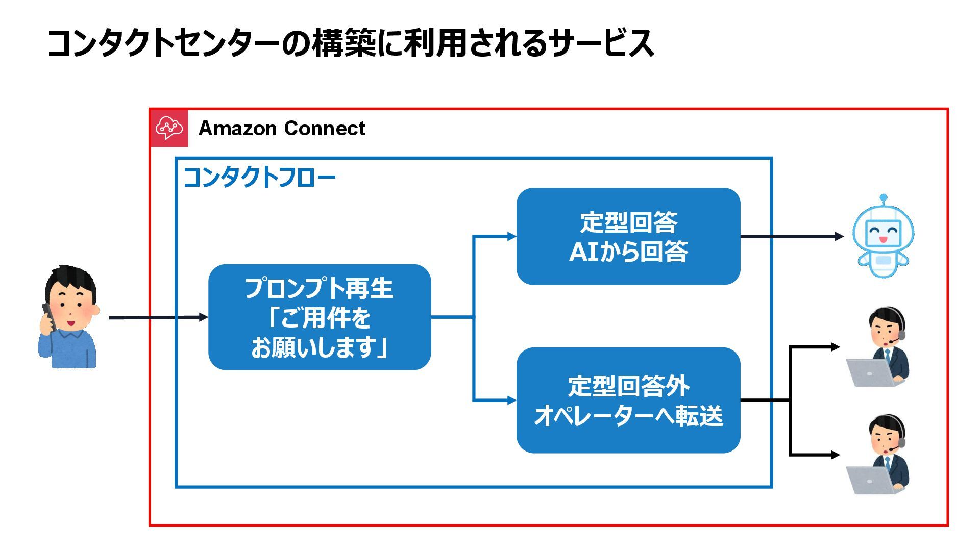 コンタクトセンターの構築に利用されるサービス Amazon Connect プロンプト再生 「ご用件を お願いします」 定型回答外 オペレーターへ転送 定型回答 AIから回答