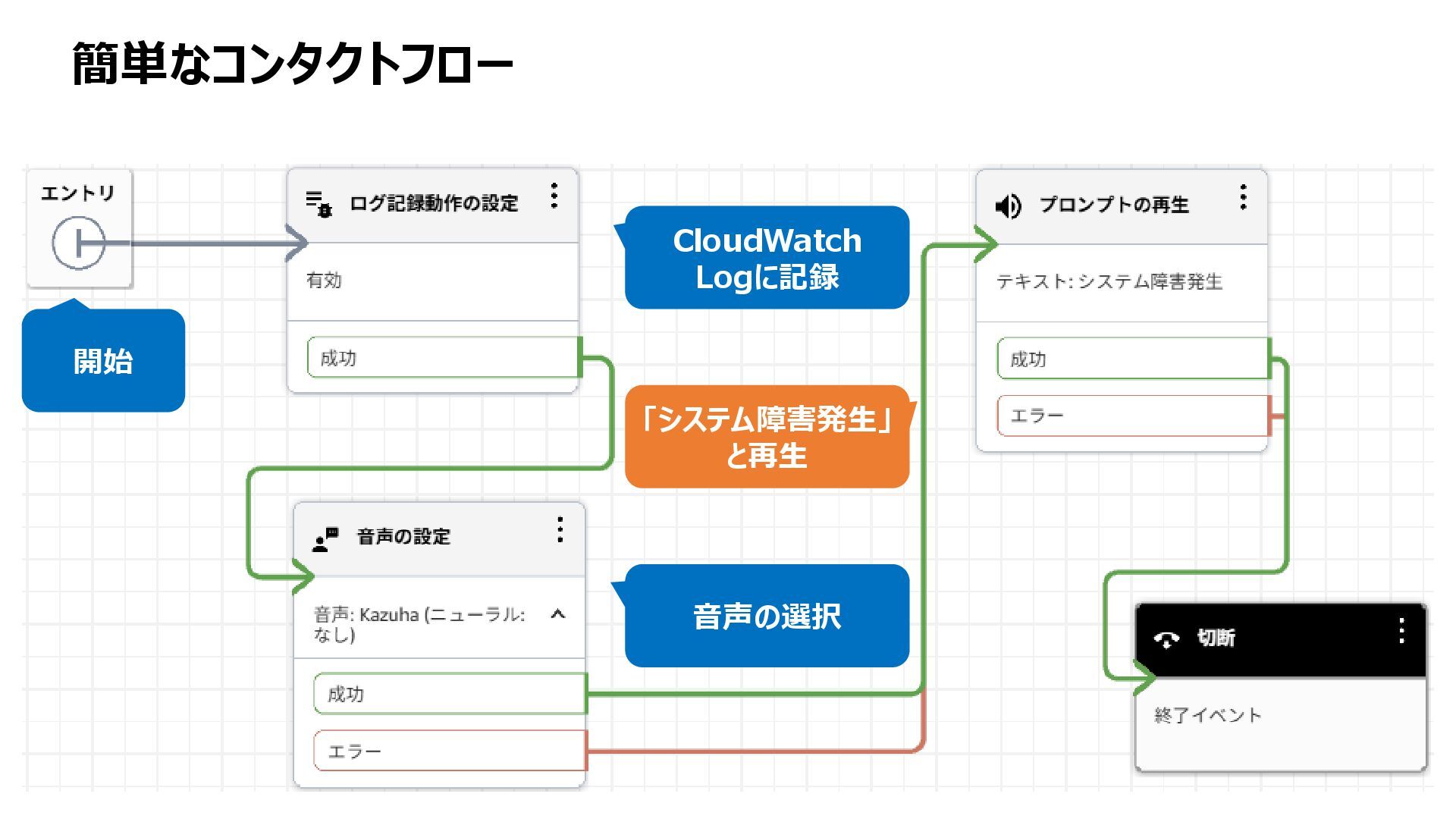 簡単なコンタクトフロー CloudWatch Logに記録 音声の選択 「システム障害発生」 と再生 開始