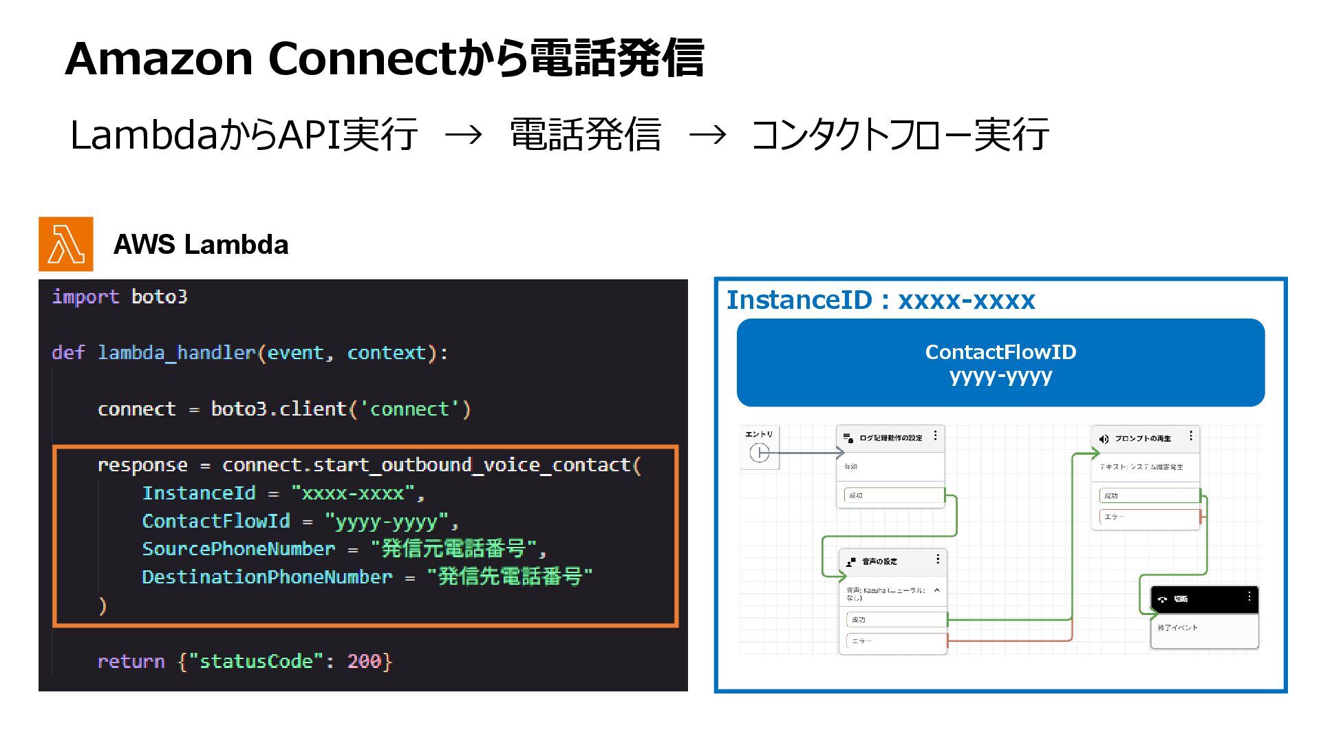 Amazon Connectから電話発信 LambdaからAPI実行 → 電話発信 → コンタクトフロー実行 InstanceID:xxxx-xxxx ContactFlowID yyyy-yyyy