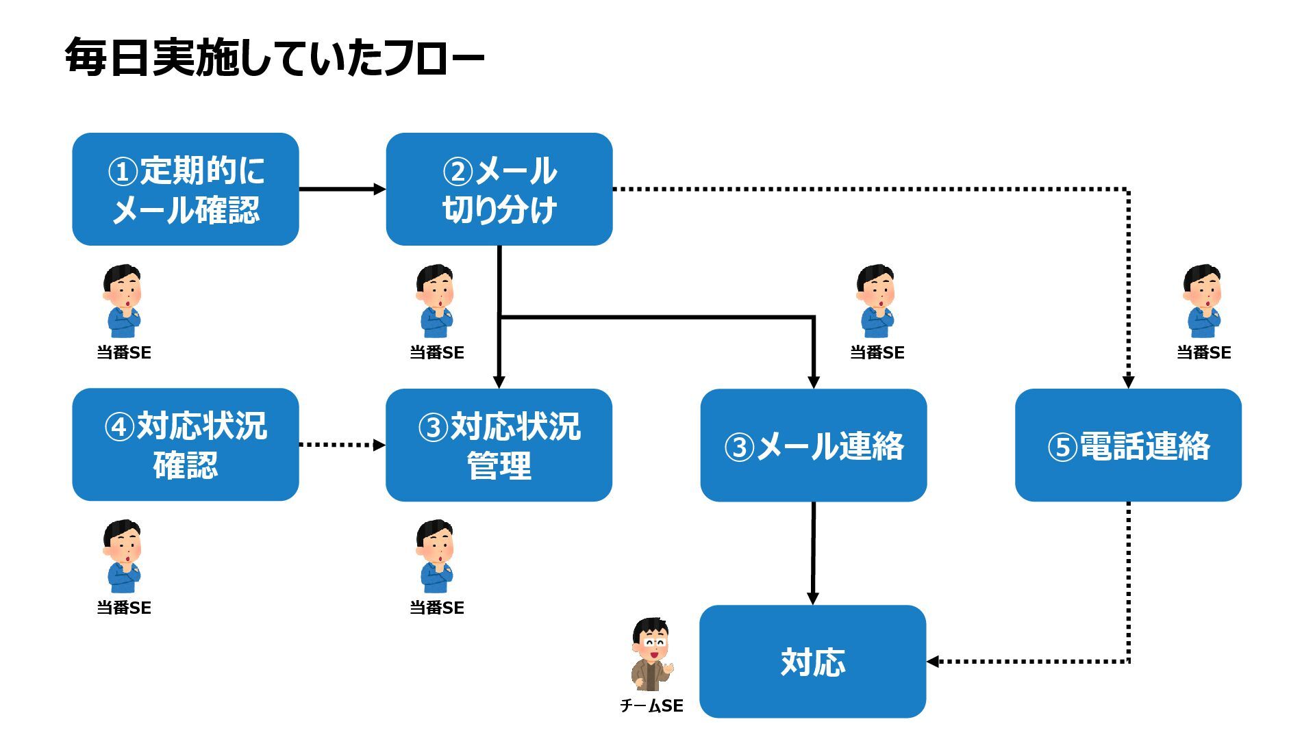 毎日実施していたフロー ②メール 切り分け ③対応状況 管理 ①定期的に メール確認 ⑤電話連絡 対応 ③メール連絡