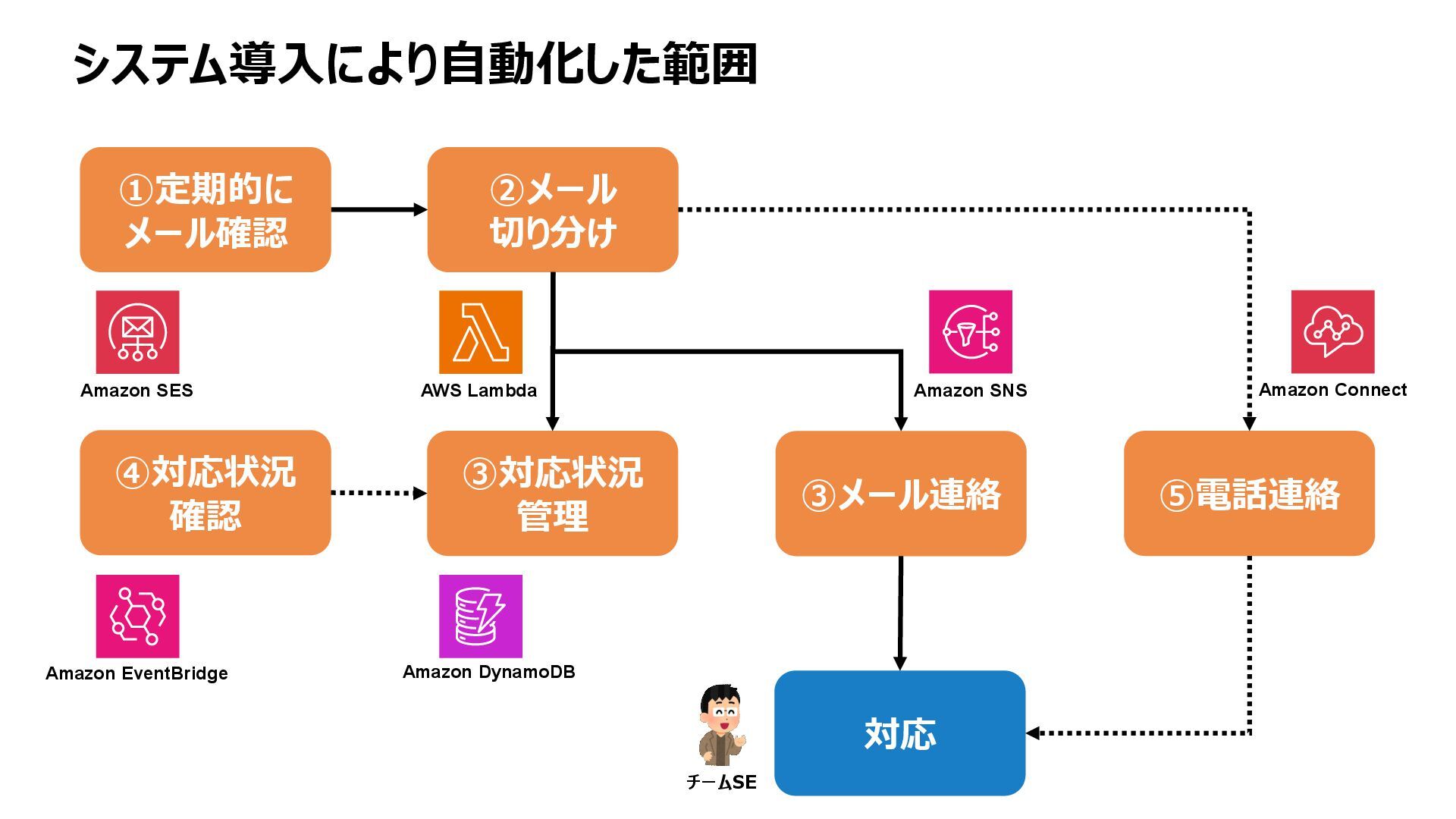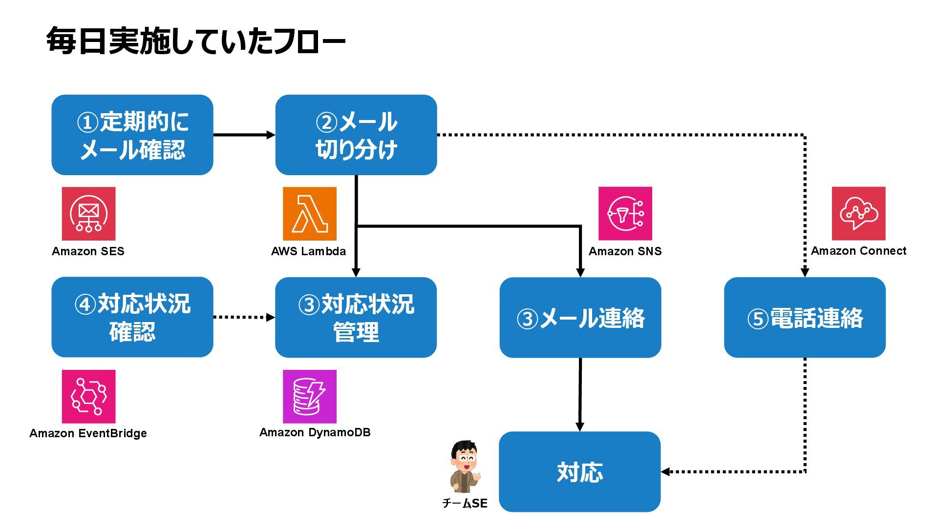 Amazon SES AWS Lambda Amazon SNS Amazon Connect Amazon DynamoDB ④対応状況 確認 Amazon EventBridge チームSE