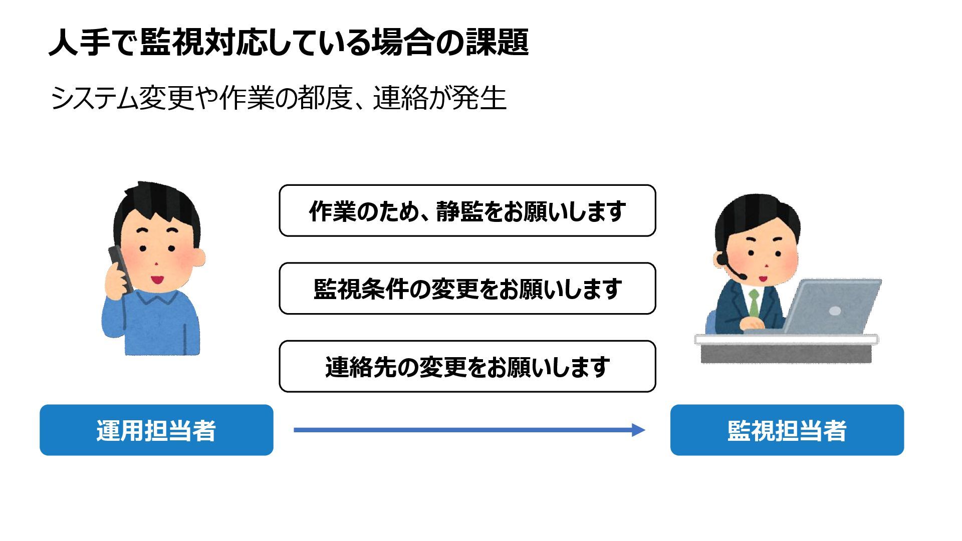 人手で監視対応している場合の課題 運用担当者 監視担当者 作業のため、静監をお願いします 連絡先の変更をお願いします 監視条件の変更をお願いします システム変更や作業の都度、連絡が発生