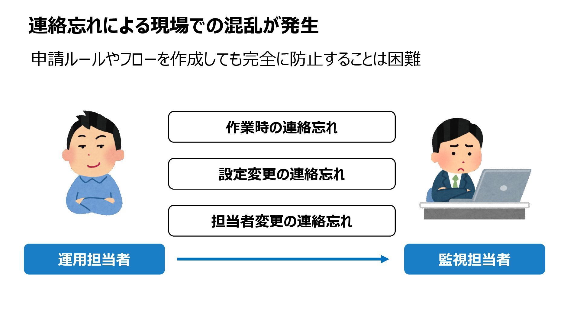 連絡忘れによる現場での混乱が発生 運用担当者 監視担当者 作業時の連絡忘れ 担当者変更の連絡忘れ 設定変更の連絡忘れ 申請ルールやフローを作成しても完全に防止することは困難