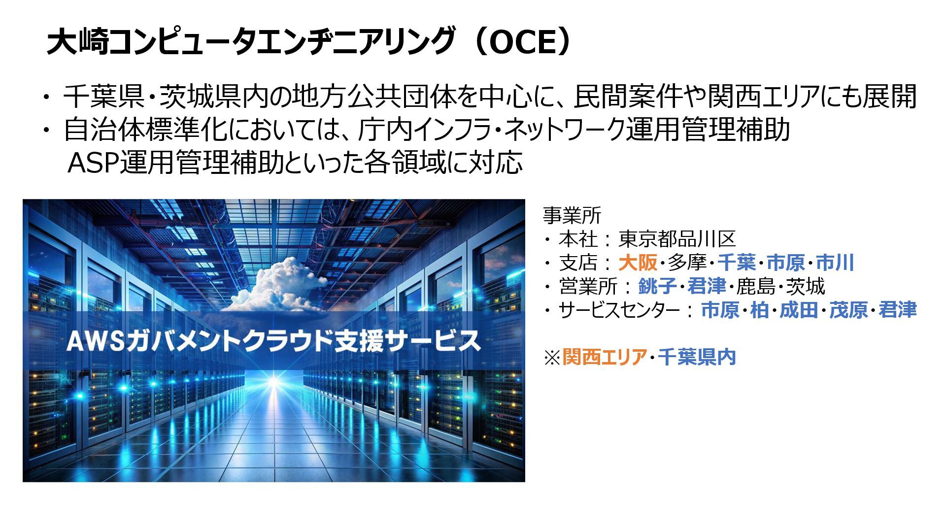 大崎コンピュータエンヂニアリング(OCE) ・ 千葉県・茨城県内の地方公共団体を中心に、民間案件や関西エリアにも展開 ・ 自治体標準化においては、庁内インフラ・ネットワーク運用管理補助 ASP運用管理補助といった各領域に対応 事業所 ・ 本社:東京都品川区 ・