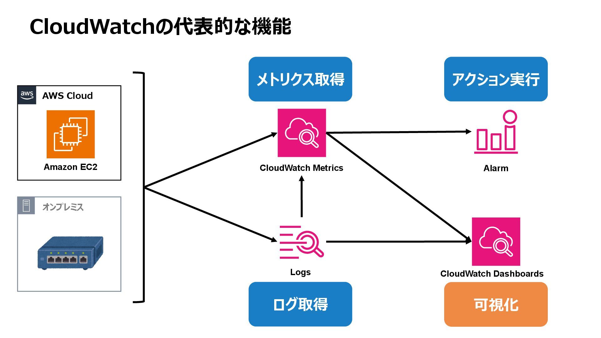 CloudWatchの代表的な機能 CloudWatch Metrics AWS Cloud オンプレミス CloudWatch Dashboards Alarm Logs