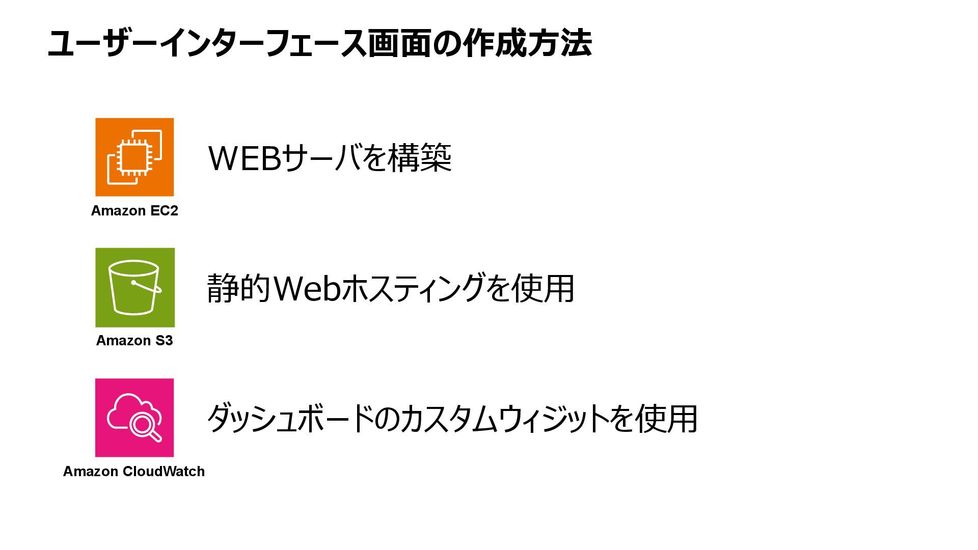 ユーザーインターフェース画面の作成方法 Amazon EC2 Amazon S3 Amazon CloudWatch WEBサーバを構築 静的Webホスティングを使用 ダッシュボードのカスタムウィジットを使用