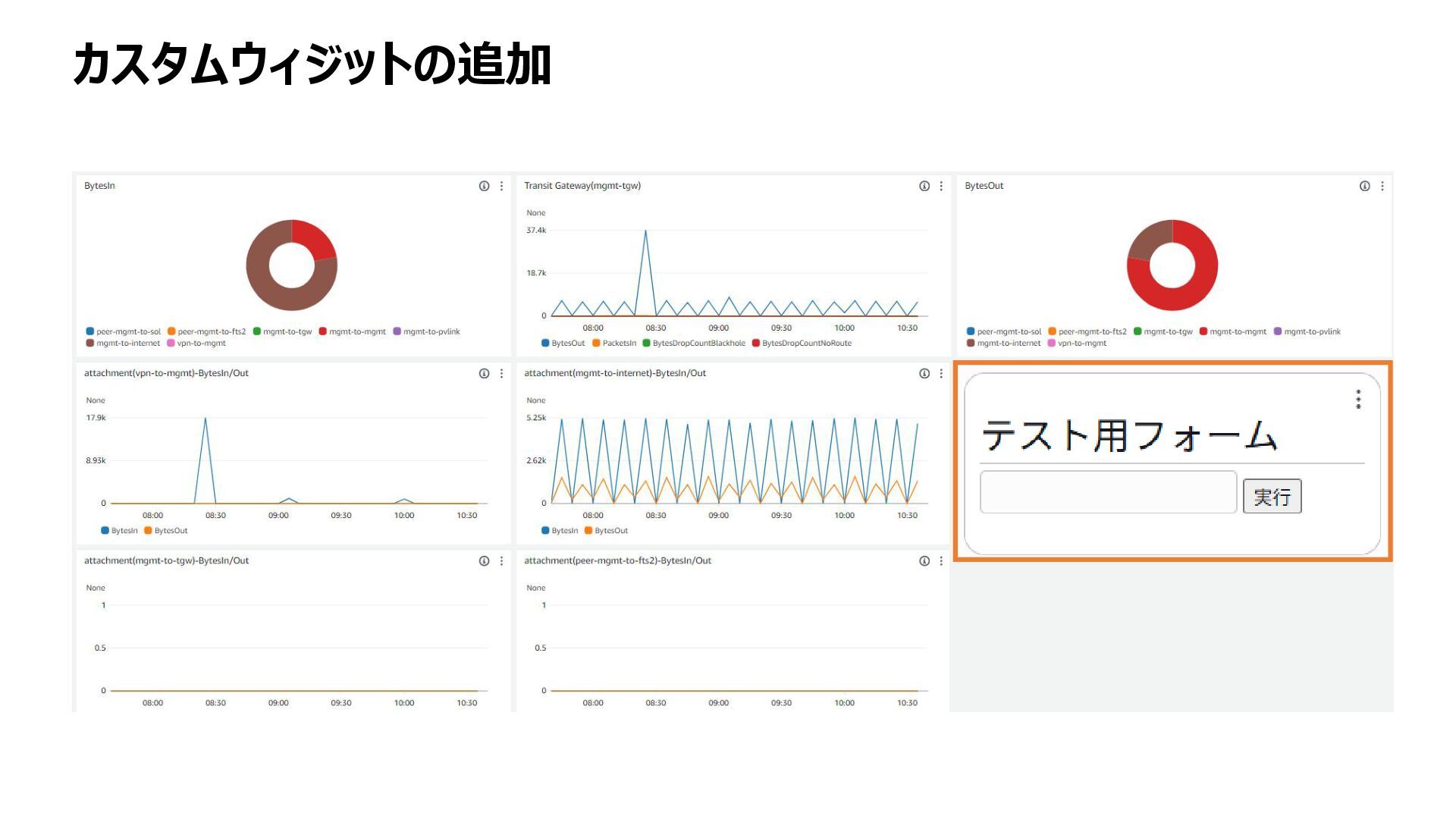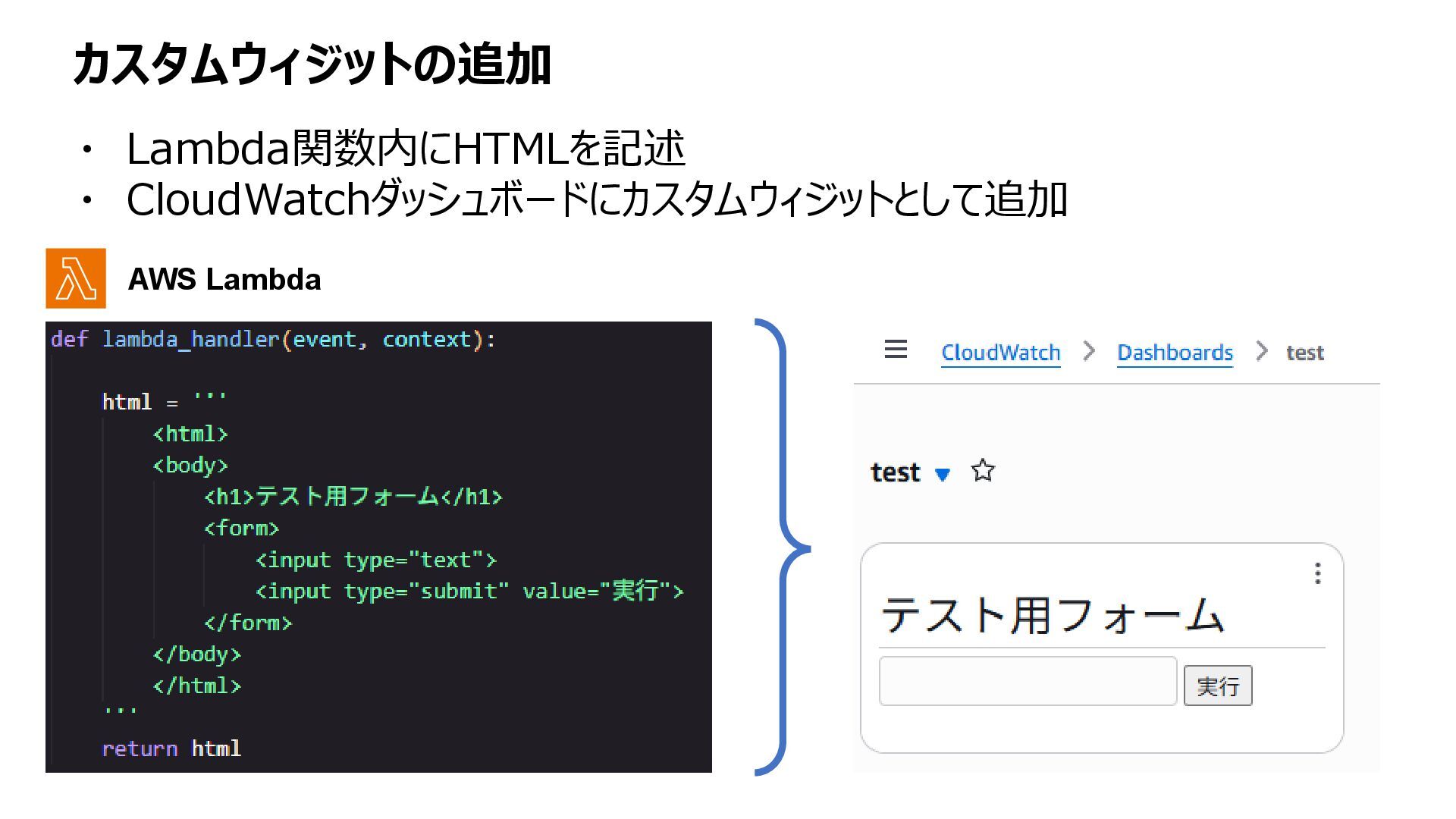 カスタムウィジットの追加 AWS Lambda ・ Lambda関数内にHTMLを記述 ・ CloudWatchダッシュボードにカスタムウィジットとして追加